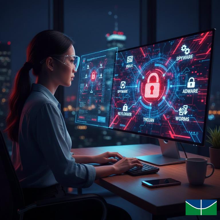 Os Códigos Maliciosos (malwares) são scripts danosos criados para explorar falhas do sistema e causar alterações indesejadas, danos, acesso contínuo, ataques DDoS, roubo de dados, spam e golpes. Existem diversos tipos (vírus, ransomware, spyware, keylogger, adware, trojan, backdoor, worms, dentre outros), com diferentes níveis de riscos.